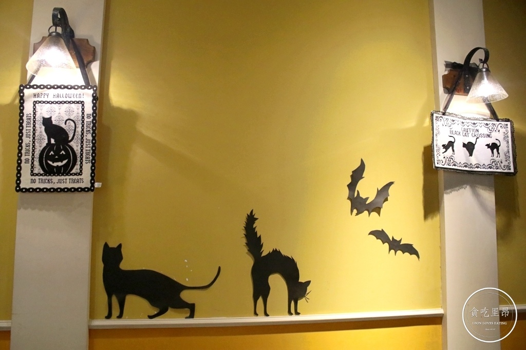 一眼掃過店內各角落,發現到處都有貓的身影,包括牆上的剪紙、壁照、玩偶.. 等等,讓萬聖節的主題氣氛中多了好多可愛和反差萌的成分XD
