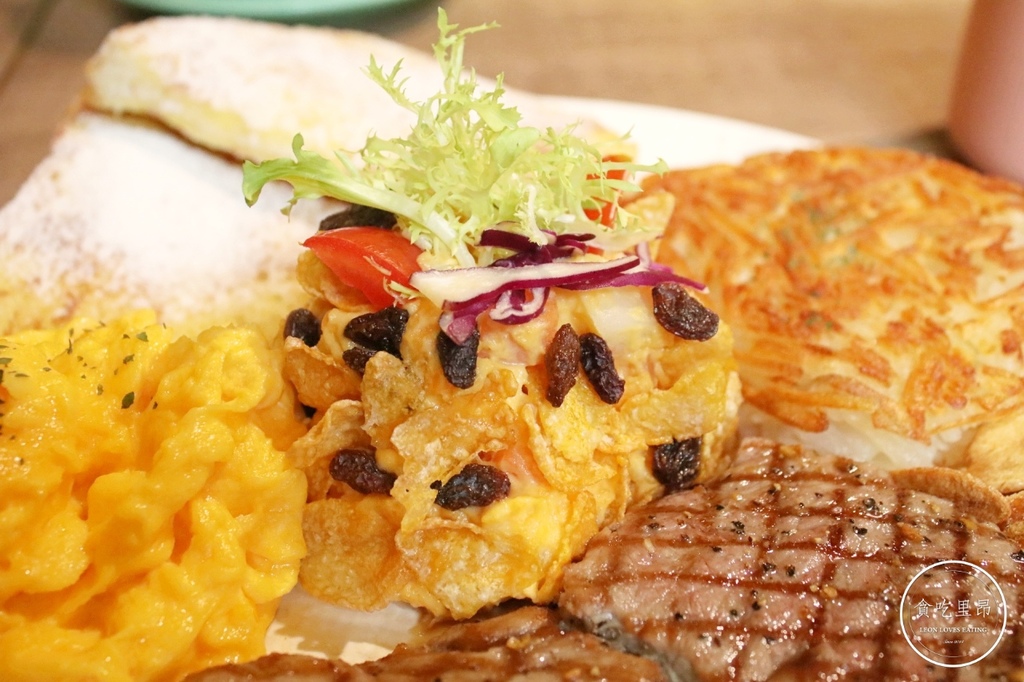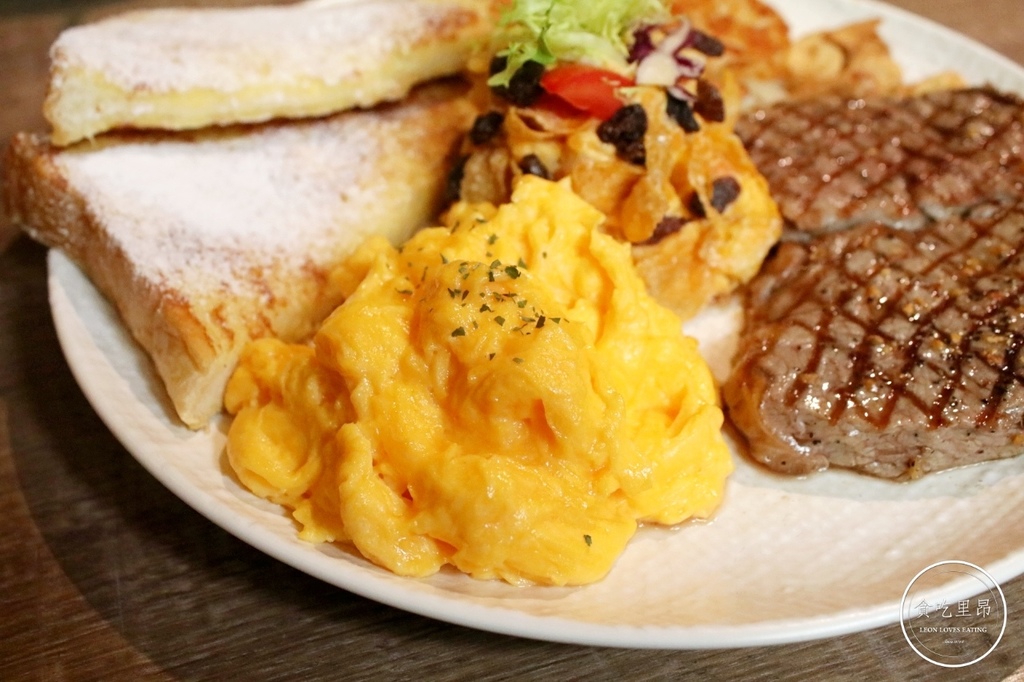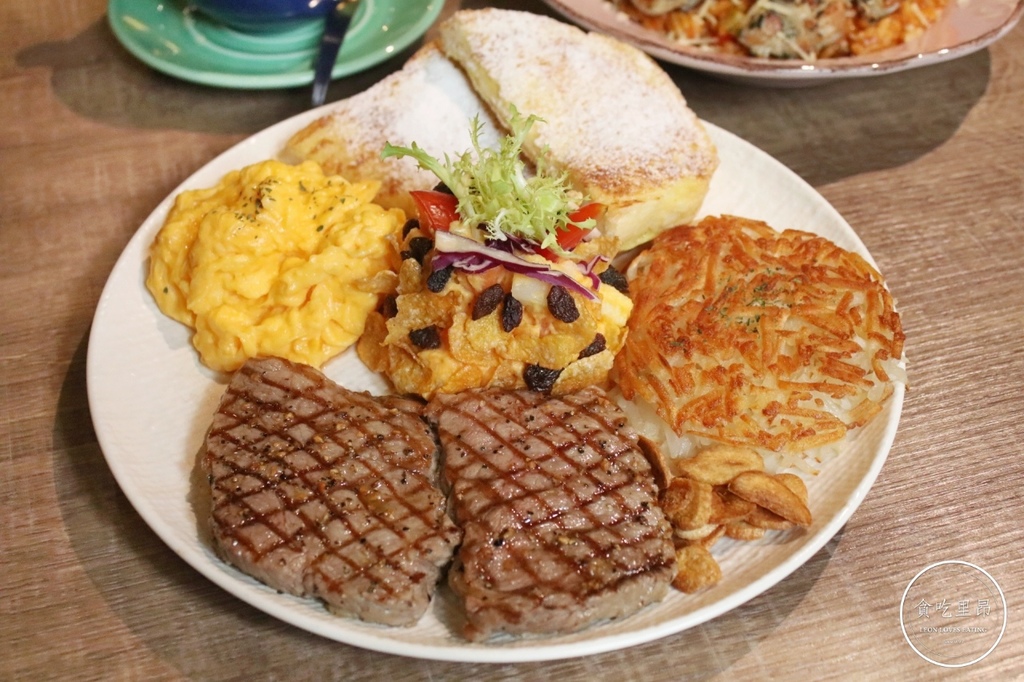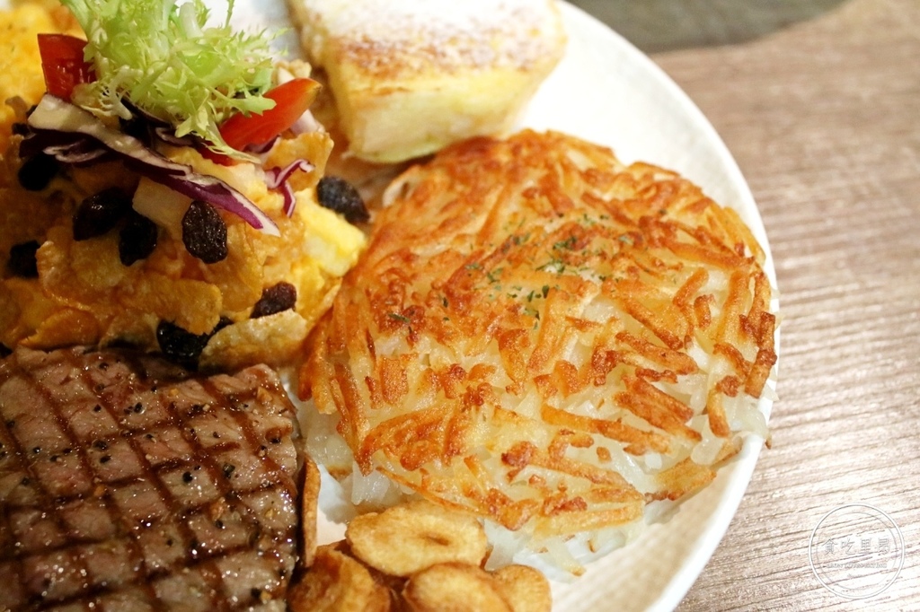 這份早午餐中除了沙朗牛之外,另外還有法式吐司、奶油炒蛋、薯餅、以及蘋果蕃薯泥沙拉(由綜合生菜沙拉替換),底下就來一一介紹囉~~